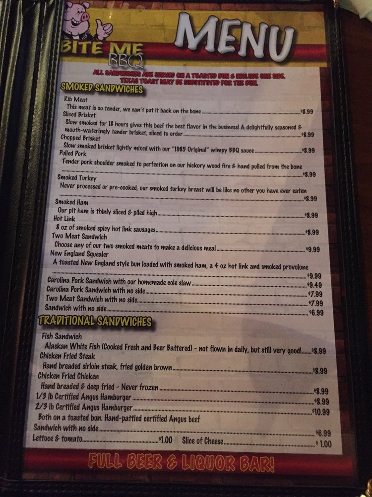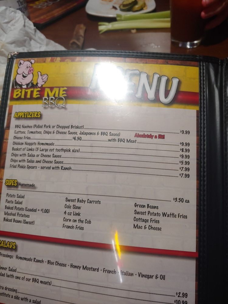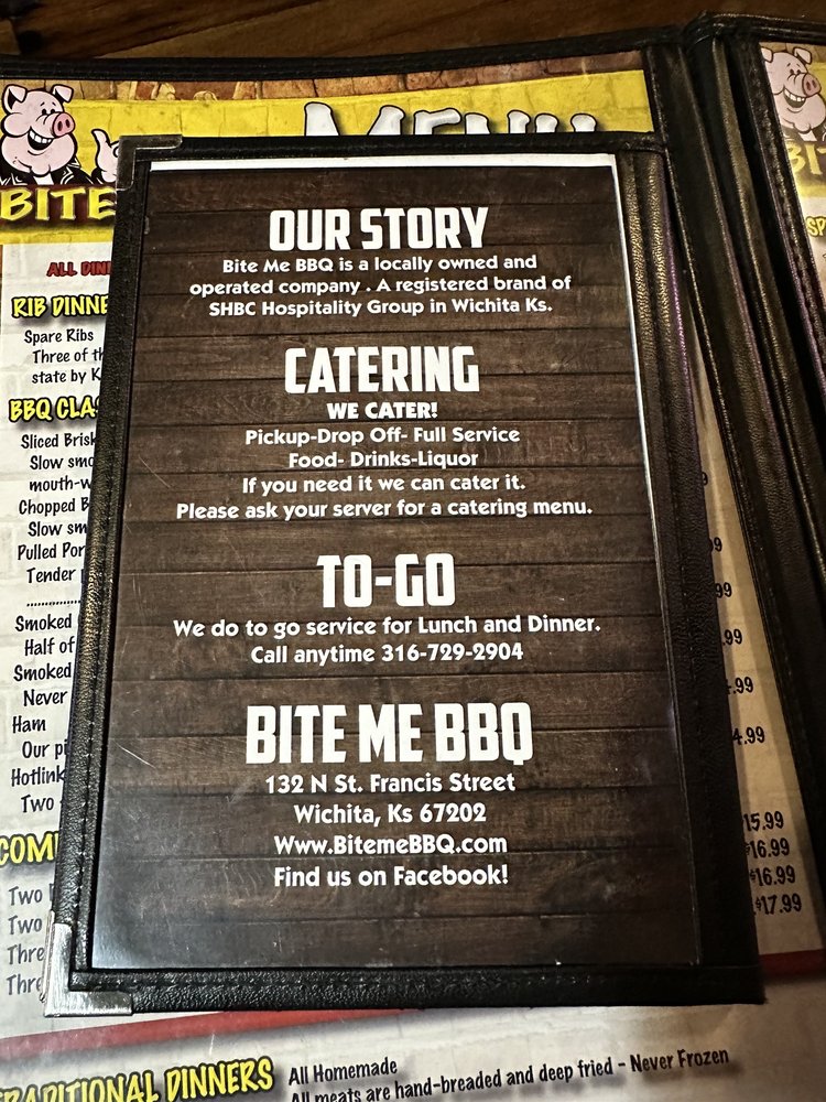 Welcome to Bite Me BBQ, a culinary gem nestled in the heart of Wichita, Kansas. This casual dining experience offers a delightful menu that focuses on mouthwatering barbecue dishes and sides. Renowned for its fall-off-the-bone spare ribs, this restaurant also excels in a variety of delicious meats, including turkey and pulled pork. Customers rave about the sauce bar, which complements meals with house-made sauces and pickled veggies.